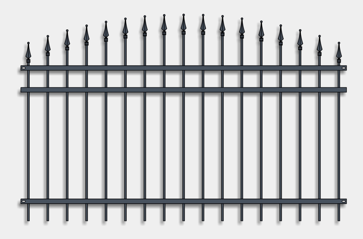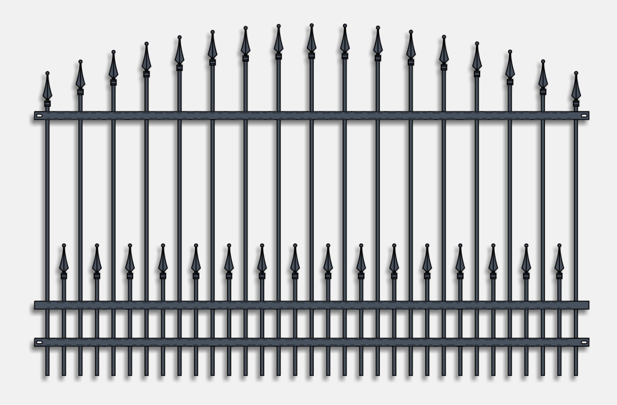 Svislé kované pruty 12x12mm v obloukovém provedení zakončené dekorativními hroty s vodorovným přepásáním plochou mačkanou ocelí 40x5mm.