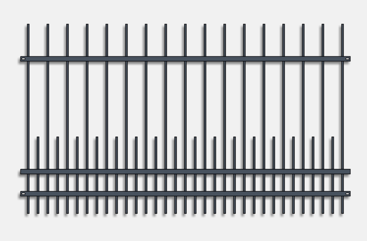 Zhuštěná svislá kovaná výplň zakončená dekorativními hroty vytváří neprostupný a bezpečný výraz umocněný silnou vodorovnou ocelí 40x5mm.